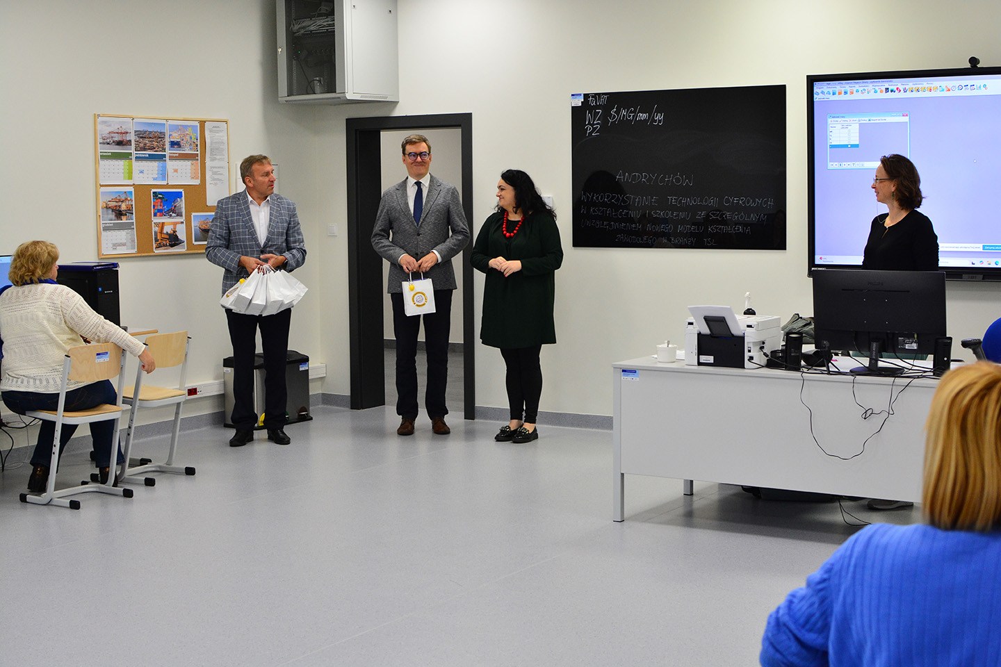 Na zakończenie tego wyjątkowego dnia Dyrektor BCU p. Tomasz Bizoń złożył serdeczne podziękowania przybyłym gościom, wręczając im na pamiątkę gadżety promujące BCU. Słowa wdzięczności skierował także do współpracowników i nauczycieli CKZiU w Andrychowie zaangażowanych w tworzenie i promocję tej nowoczesnej placówki.