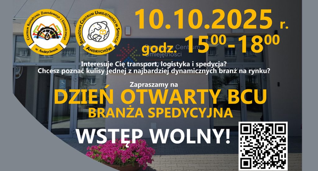 Interesuje Cię transport, logistyka i spedycja? Chcesz poznać kulisy jednej z najbardziej dynamicznych branż na rynku? Zapraszamy na Dzień Otwarty BCU, gdzie odkryjesz, jak wygląda praca spedytora od kuchni! Data: 10.10.2025 Miejsce: BCU przy Centrum Kształcenia Zawodowego i Ustawicznego w Andrychowie, ul. Starowiejska 22a Godzina: 15:00 – 18:00 W programie: Spotkania z doświadczonymi spedytorami Case […]