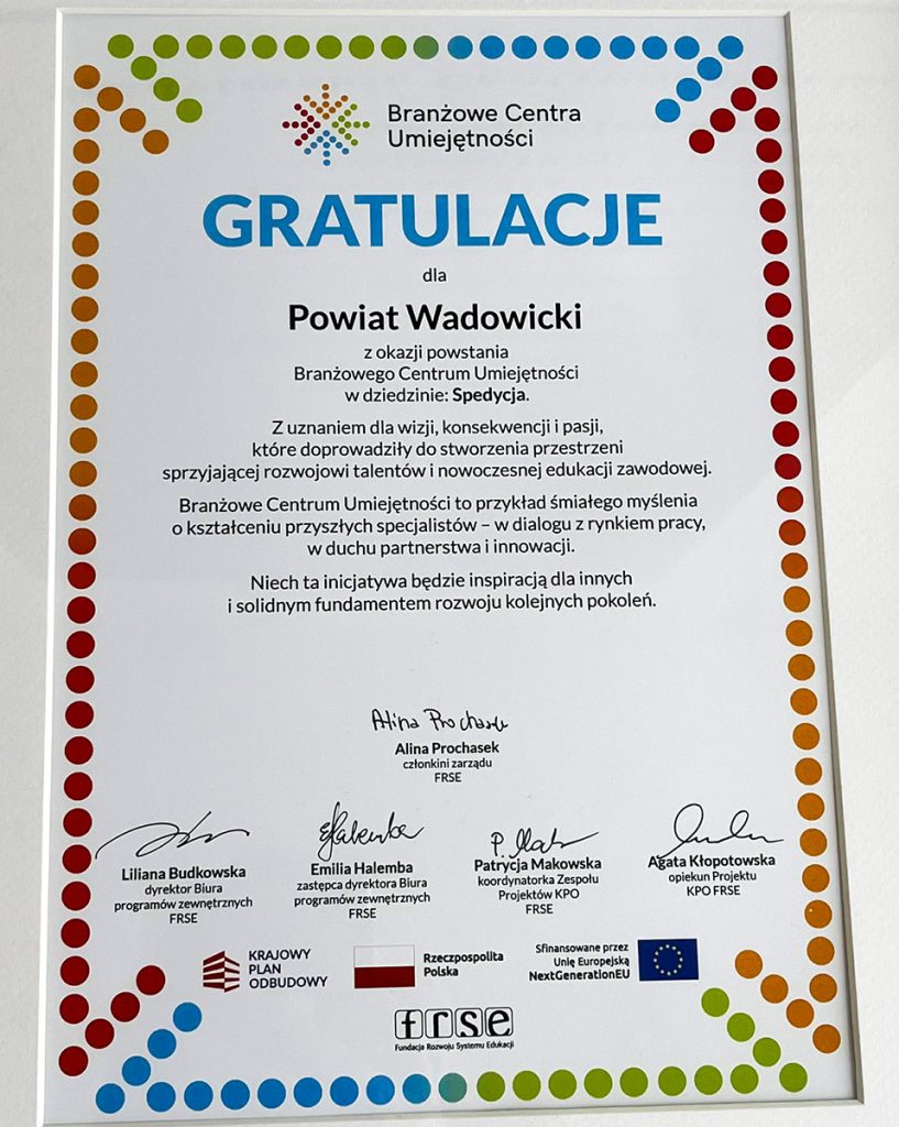 W dniach 16-17.10.2025 podczas seminarium:,, Sieciowanie i budowanie marki Branżowych Centrów Umiejętności odbywającego się w Gdyni, otrzymaliśmy z rąk Pani Aliny Prochasek – Członkini Zarządu Fundacji Rozwoju Systemu Edukacji oraz Pana Piotra Bartosiaka – Dyrektora Departamentu Kształcenia Zawodowego w Ministerstwie Edukacji Narodowej statuetkę oraz list gratulacyjny za odwagę tworzenia przyszłości, za utworzenie i prowadzenie naszego Branżowego Centrum Umiejętności w dziedzinie Spedycji, przestrzeni która rozwija talenty i buduje kompetencje.